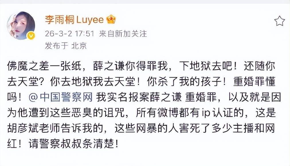 同日,李雨桐进一步指控薛之谦涉及"重婚罪",声称胡彦斌告知其"微博IP可追查网暴者",并提及薛之谦"选妃""贬低张杰唱功""砸毁张学友吉他"等争议行为。